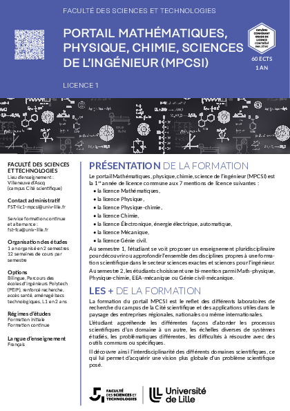 La première année de licence, au sein du portail MPCSI (Mathématiques, physique, chimie, sciences de l'ingénieur), permet à l’étudiant d’appréhender plusieurs disciplines du domaine sciences et technologies telles que les mathématiques, la chimie, la physique, la mécanique, l’électronique, le génie civil afin d’étendre ses connaissances et ses compétences scientifiques.